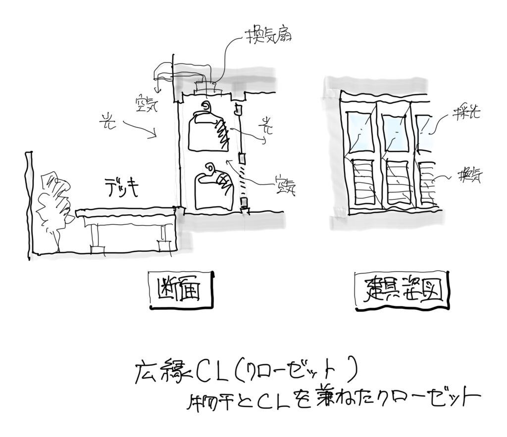 広縁CL(クローゼット): 図面の一番下の部屋です。室内からそのまま物干しスペース(広縁)にアクセスでき、乾いた洗濯物をそのままクローゼットに収納できる動線。機能性とデザイン性を両立しています。