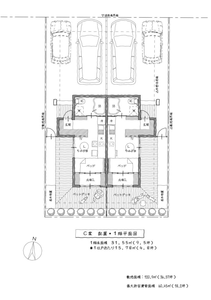 今回の計画地は、36坪という昨今の住宅地としてはややコンパクトな敷地。この土地で、なんと長屋形式の2住戸プランを実現しました!投資用としても魅力的な、左右対称の設計です。