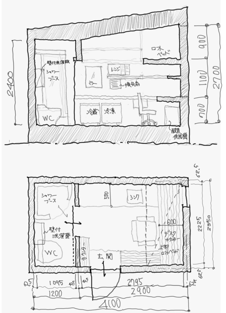 ということで、500万のタイニーハウスなら、どの程度にプランが提供できるかスケッチしてみました。